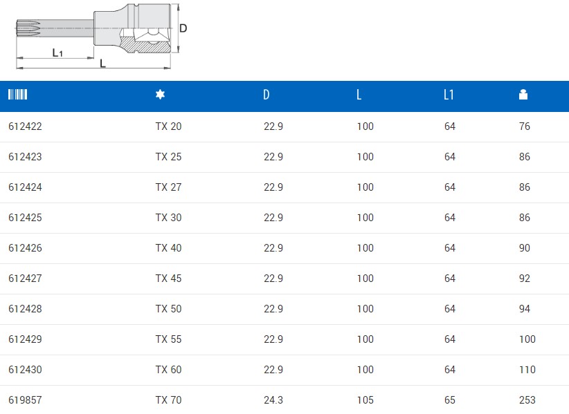 Μακρύ Καρυδάκι για βίδες TORX (TX) 1/2" 192TX, διάσταση TX40
